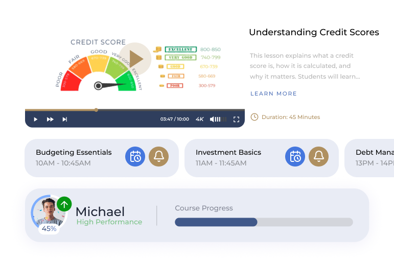 Our K-12 customized programs align with educational standards, providing engaging lessons, interactive tools, assignments, test questions, and full teacher support to help students master money management from an early age.